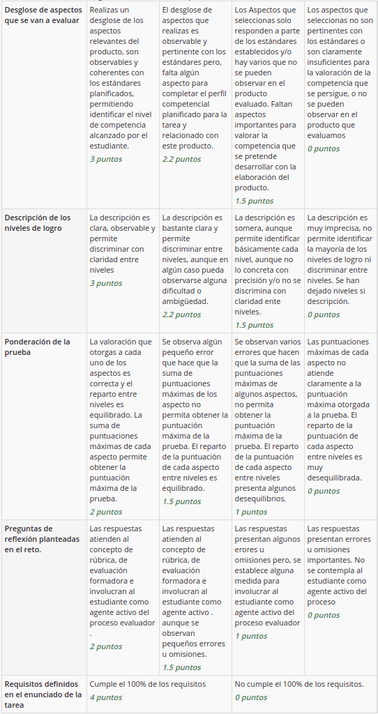 En este reto os proponemos elaborar una rúbrica que exprese y gradúe los resultados que esperáis obtener con el producto elaborado en la Tarea Integrada que habéis diseñado en el Bloque 2. Os permitirá compartir con los estudiantes las metas a alcanzar y así poder trabajar codo con codo para alcanzarlas y ayudarles a autoevaluar y gestionar sus procesos.