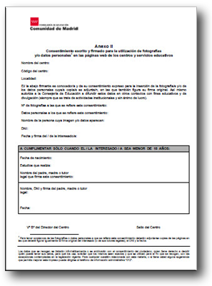 El apartado 8 de la Instrucción de la Viceconsejería de Educación, sobre la inclusión en el portal Educamadrid de las páginas o sitios Web de los centros y servicios educativos, señala que "…el Director del centro debe contar con el consentimiento por escrito, según el formato que se incluye en el Anexo II, de todas las personas cuya imagen y otros datos personales (nombre, correo electrónico…) aparezcan en las páginas Web, siempre que a través de ellos se les pueda identificar…" El anexo II de esta instrucción incluye un modelo de consentimiento para la publicación de datos y/o fotografías.