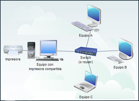 Nos queda la tercera pata del taburete, compartir impresoras. Aunque todavía no se ha generalizado el uso de impresoras en red en el ámbito doméstico, contamos con ellas en todos los centros. Para simplificar, una impresora de red no se conecta directamente a un ordenador sino a la red mediante un cable igual que el que sirve para conectarse a los ordenadores. Por otro lado también es muy útil compartir una impresora conectada a mi ordenador, actualmente por USB, con otros ordenadores.