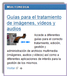 Desde aquí podremos acceder a diferentes guías para el correcto tratamiento, edición, gestión y administración de archivos multimedia (imágenes, audios y vídeos) así como a diferentes aplicaciones de interés para la gestión de los mismos