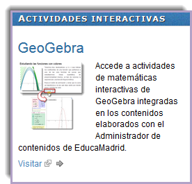 En este apartado podrás encontrar actividades de matemáticas interactivas realizadas con GeoGebra integradas en los contenidos elaborados con el Administrador de contenidos de EducaMadrid.