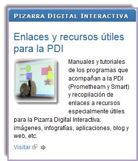Manuales y tutoriales de los programas que acompañan a la PDI (Prometheam y Smart) y recopilación de enlaces a recursos especialmente útiles para la Pizarra Digital Interactiva: imágenes, infografías, aplicaciones, blog y web, etc.