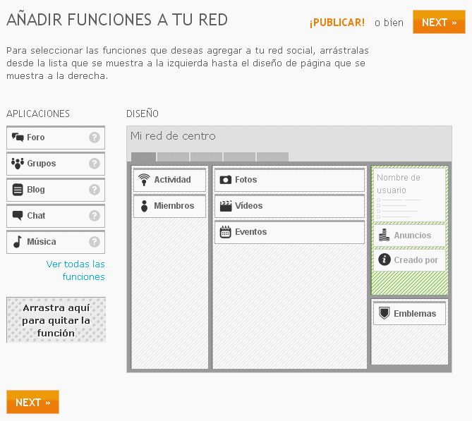 6. Pulsamos en Próximo (Next). Aparece la página de Añadir funciones a tu red. Podemos agregar nuevas funcionalidades arrastrándolas desde Aplicaciones hasta Diseño. En principio, siempre deberíamos de añadir, al menos, el foro.
