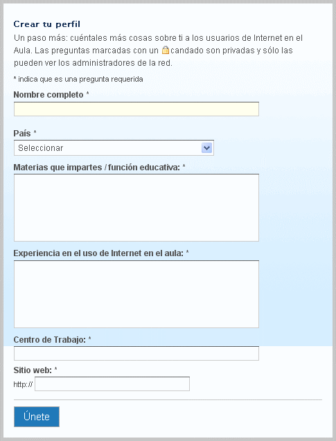 4. Aparecerá una nueva ventana solicitando nuevos datos. Los campos con asterisco debemos rellenarlos de forma obligatoria: nombre, país, ciudad, materias que se imparten o función educativa, experiencia en el uso de interente en el aula, centro de trabajo y un sitio web. No es obligatorio incluir una foto o imagen. De no disponer de una dirección web personal, lo mejor es enlazar a una web educativa oficial.