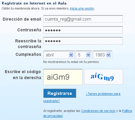 2. Aparecerá una ventana de registro en las que nos solicitarán escribir nuestro correo electrónico, contraseña, fecha de nacimiento y el código de seguridad que se visualiza en la imagen adjunta. A veces, cuando sólo queremos probar un servicio, es mejor utilizar una dirección de correo diferente a la habitual, pues podrían llegar numerosos mensajes a nuestro correo. No obstante, la recepción o no de mesajes en el correo puede configurarse en nuestro perfil.