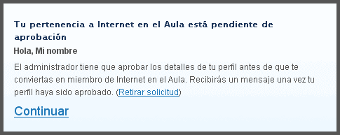 6. Aparecerá un nuevo mensaje indicando que la pertenencia a la red está pendiente de aprobación. Los administradores tienen que revisar los detalles del perfil antes de autorizarnos a ser miembros de Internet en el Aula. Recibiremos un mensaje una vez el perfil haya sido aprobado.
