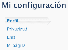 Configuración. Permite configurar nuestro perfil, privacidad, página personal en la red y tipo de notificaciones que se enviarán a nuestro email.