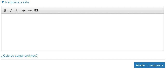En el cuadro de texto de una respuesta se nos ofrece la posibilidad de incluir enlaces, imágenes y archivos. Los archivos podemos subirlos mediante la opción ¿Quieres cargar archivos? bajo el cuadro de texto.