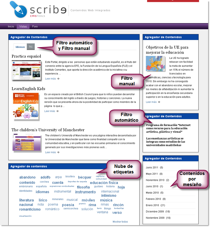 - El Agregador de contenidos es la herramienta que tendremos que emplear para hacer visibles los contenidos en nuestro espacio web.