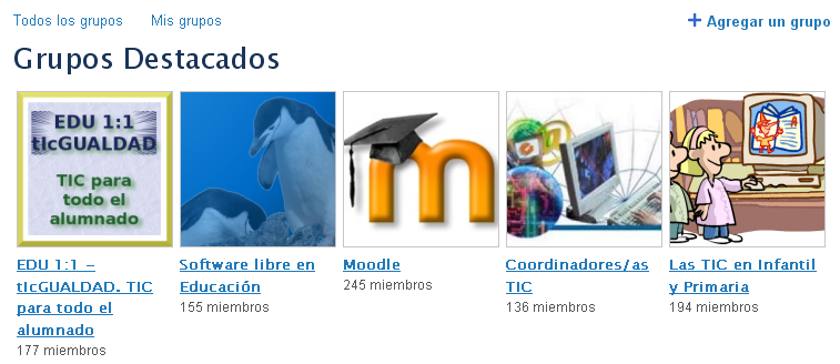 Grupos. Pemite que los miembros se agrupen en función de sus intereses. Podemos crear nuestro propio grupo pulsando en Agregar un grupo. Una vez creado, es conveniete configurar las opciones de privacidad del mismo. Para unirnos a un grupo sólo tenemos que pulsar en Únete a...