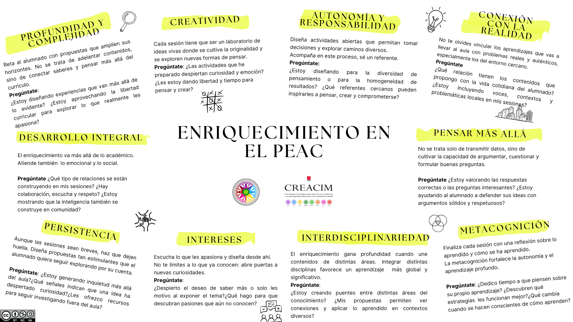 Todo ello pensado para que tengáis la información a mano, compactada y clara, y os sirva como guía práctica tanto para la planificación de vuestras sesiones PEAC como para la reflexión pedagógica de mejora de las mismas.